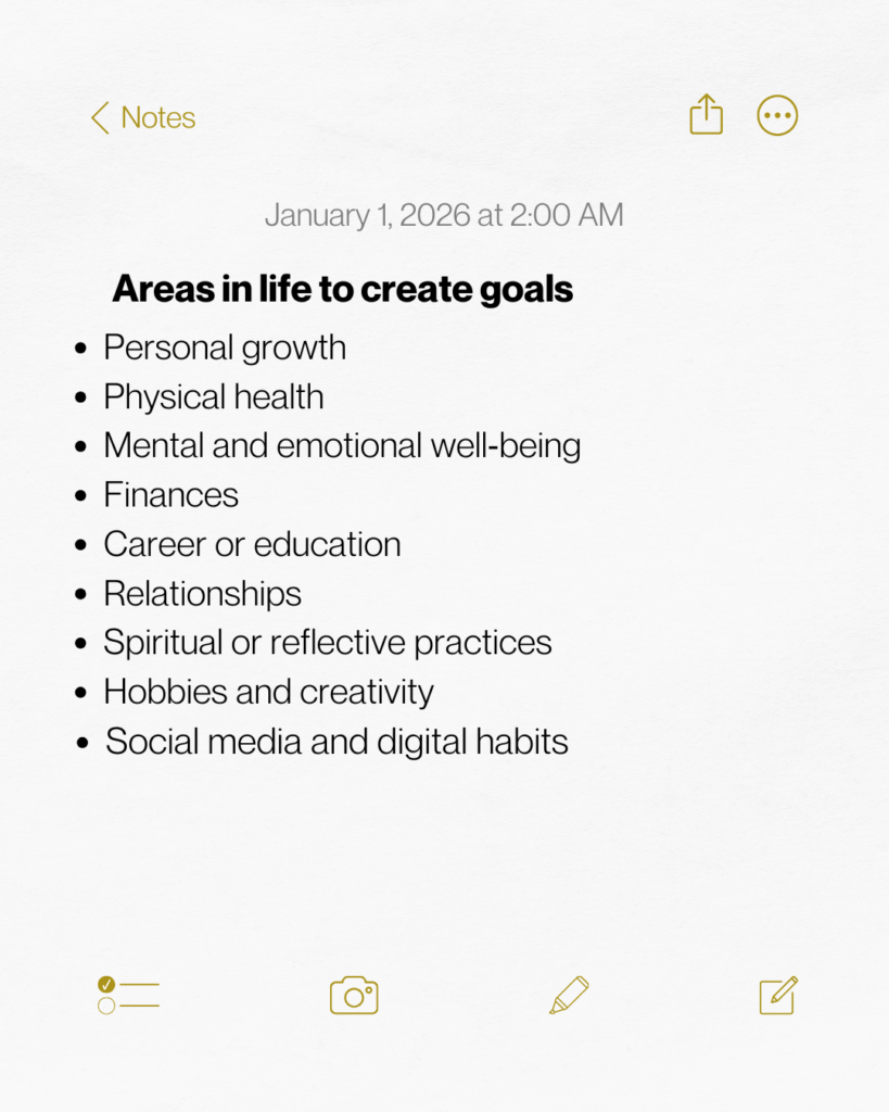 Before setting goals, it helps to identify where you want change. Goals are most effective when they are connected to meaningful areas of life rather than vague self‑improvement.
